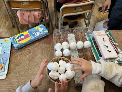 15−8の計算を、1パック10個入りの玉子を操作しながら、2つの方法で考えました。
