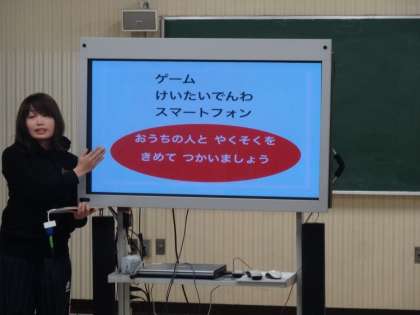 続いて、山田先生から、「冬休みのくらし方」のお話がありました。タブレット端末と電子黒板を接続して、実際の危険個所を示したり、図を使ったりして、わかりやすく説明してくれました。
