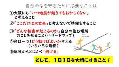 阪神淡路大震災・東日本大震災のようすから、災害時に自分の命を守るためにできることについて話をしました。