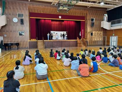 今年度最初の児童集会。4・5・6年の集会委員にとっても初めての集会でしたが、大きな声で盛り上げていました。