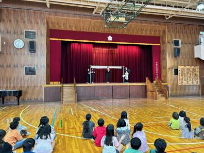 今日は、白い幕が少しずつ上がっていき、後ろにいる先生をあてるゲームでした。登場した先生は、リコーダーの演奏をしたりギターを弾く振りをしたりして、子どもたちはとても楽しそうでした。