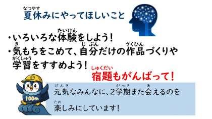 終業式で、AI(人工知能)のことから、夏休みにがんばってほしいことについて話をしました。