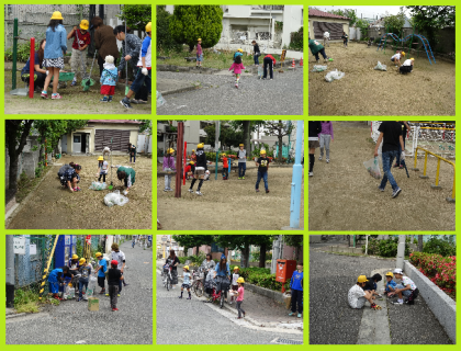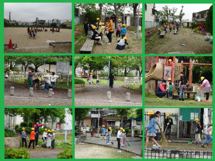 校区内の公園などに子どもたちが(ほぼ)地区別児童会単位で行き、保護者や地域の方々と一緒に、ごみを拾ったり、草を抜いたりして、町の美観を守ろうという取組です。