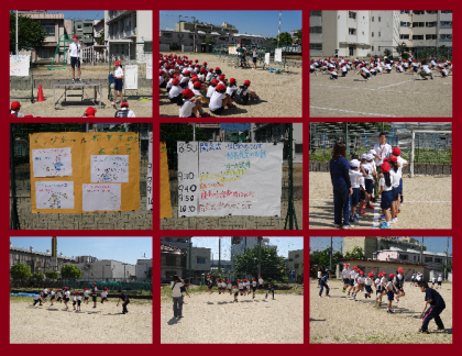 ではまず、開会式と長縄跳びのようすを写真でごらんください。みんなかけ声に合わせてがんばりましたよ。1年生もリーダーさんや副リーダーさんの言うことをよく聞いてがんばることができました。
