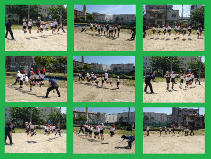 5月18日(水)、ドッジボール大会を行いました。1〜3年生はドッジビー(ウレタン製のフライングディスク)、4〜6年生は軽くてやわらかいボールを使ったドッジボール、そして各班で行う、長縄とびの以上3種目でした。