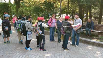 お弁当を食べた後、平和集会をしました。そのあとは、フィールドワークをしています。がんばってインタビューしてね。