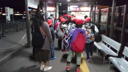 広島電鉄に約1時間ほど乗って、宮島口に到着しました。もう辺りは暗くなりました。これから、フェリーで10分間の船旅を楽しんで、宮島に上陸します。そろそろ、みんなにも疲れた感じが…?!