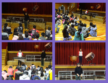 1年生による音楽集会。今日は、先生が楽器の音色をクイズにしました。
