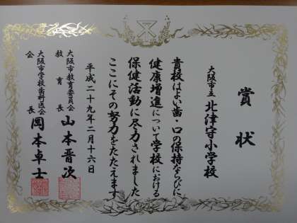 よい歯・口の保持ならびに健康増進についての学校での保健活動が認められて、下のような賞状をいただきました。