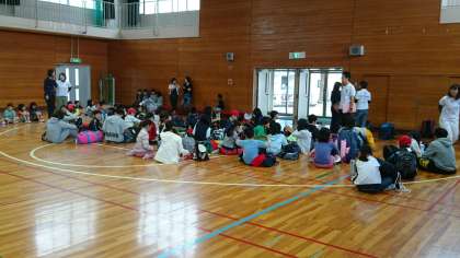5年生・6年生による一泊移住が始まりました。出発式のようすです。