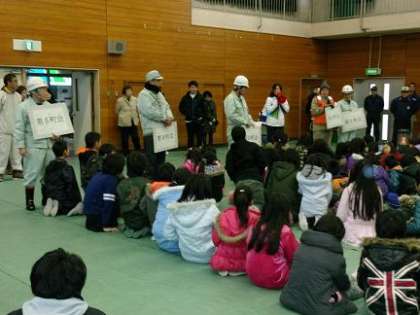 子防プロのみなさんの発表の後は「もしも、学校が休みの日に地震や津波が起こったら…。」という想定のもと、町会毎に避難する訓練を行いました。町会毎にというの