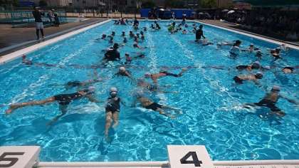 2コマめは、全校でプールに入り、ニコニコ班で楽しくゲームをしました。お家の方もたくさん見に来てくださいました。