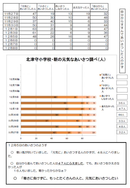 12月5日の「あいさつ」と「黄帽子」の結果です。