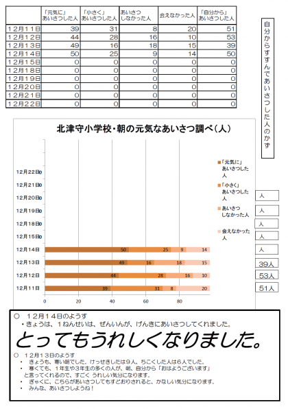 12月14日 朝のあいさつ と 黄帽子 1ねんせい、やりました!