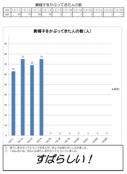 14人 ぜんいんが、黄ぼうしをかぶって登校することができました。