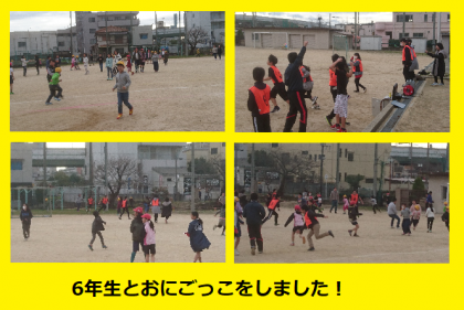 児童集会がありました。今日は6年生が主役の「おにごっこ」です。