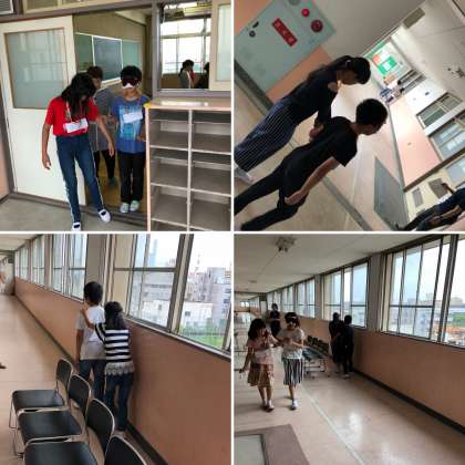 視覚障がいの方や盲導犬についてのDVDを見た後、実際にアイマスクをつけて、視覚に障がいのある方の気持ちや介助する方法などを知り、自分たちにできることを考えました。