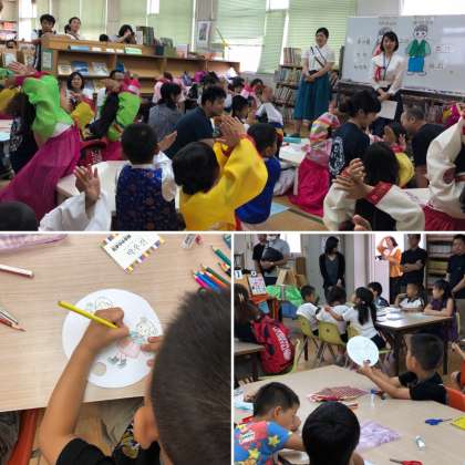 各学年に分かれての活動をするのですが、よその学校のチング(友だち)ともすぐ仲良くなり、チョゴリについて学んだり、キムチについて学んだりしました。