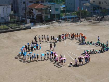 児童・教職員みんなが参加して、校章のサクラをつくりました。