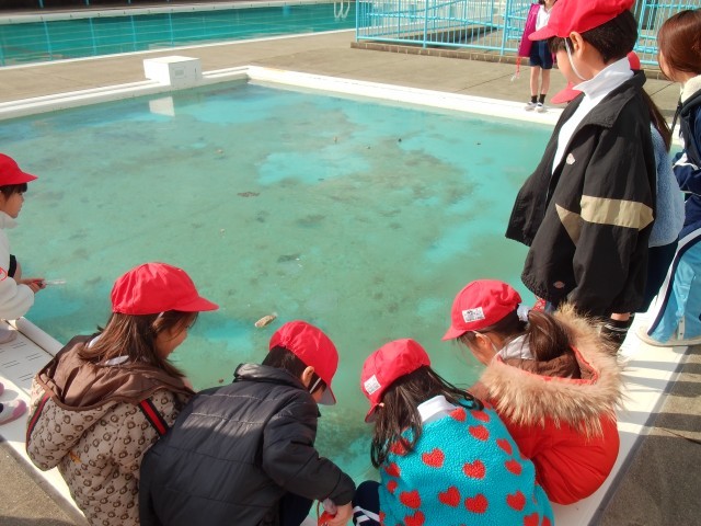 1年生活科では身の回りの冬を見つける学習があるので、実際に見に行きました。写真の通り、少し大きめの石がのっかっても割れないほど厚みのある氷を見て、子どもたちは歓声を上げていました。「プールに入りたい!」という子もいましたが、もちろん入っていません。