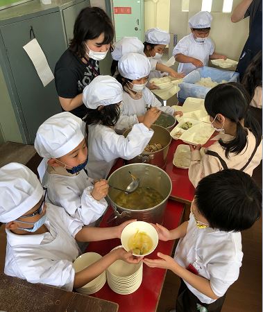 先週までは、食器におかずを入れる作業は主に先生が行っていましたが、最近では児童たちがそれぞれの役割に分かれて行うようになりました。おかずなどを入れる給食当番も、みんなの机に運ぶクラスの児童もみんな一生懸命頑張っていて、だんだんと手際よく配膳できるようになってきています。