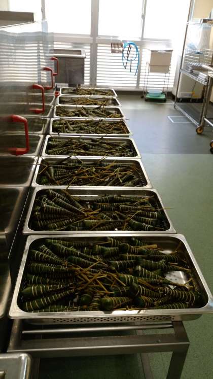 きょうのこんだては「牛肉のちらしずし、すまし汁、ちまき、牛乳」です。ちまきは、もちの一種で端午の節句にちなんだ和菓子です。もち米やうるち米、米粉などで作ったもちを円錐形にして笹で巻き、い草でぐるぐる巻きに縛って作ります。給食室で蒸した後、葉をむいて食べます。