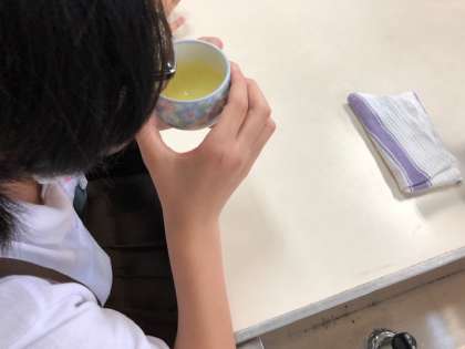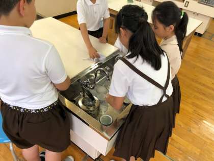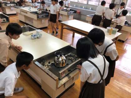 本日5年生は、初めて家庭科室でガスコンロを使ってお湯を沸かす実習を行いました。家庭科室でのルールや、ガスコンロの安全な使い方、お湯の沸かし方を学習し、最後にはきゅうすでお茶を入れました。「熱い!」と言いながらも、おいしくお茶を飲むことができました。最後までグループできちんと分担し、実習に取り組むことができました。次回の調理実習が楽しみです。