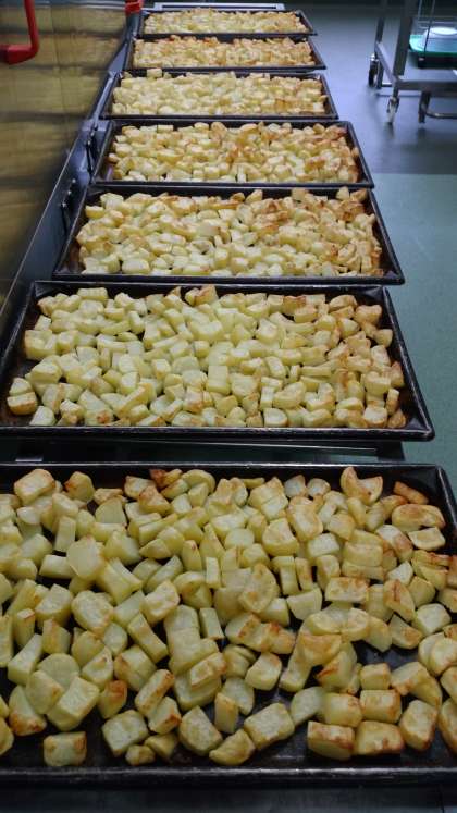 今日の給食は「豚丼、ゆばのすまし汁、焼きじゃが、牛乳」です。給食室では焼きじゃがができあがったところでした。塩で下味をつけた生のじゃがいもを鉄板に広げて蒸し焼きにします。小おかずで1人分は少ない量でしたが、500人分になると、ずい分多くなりますね。