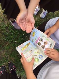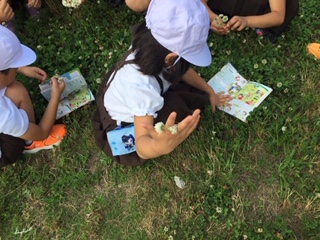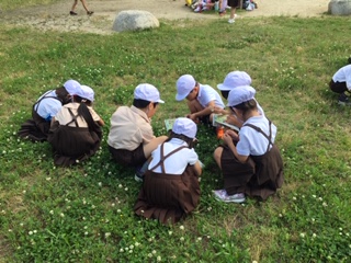 1年生公園探検で、夏見つけと、友だちの良いところ発見をしています。シロツメクサで花輪を作ったりバッタや四つ葉のクローバーを見つけたりしています。