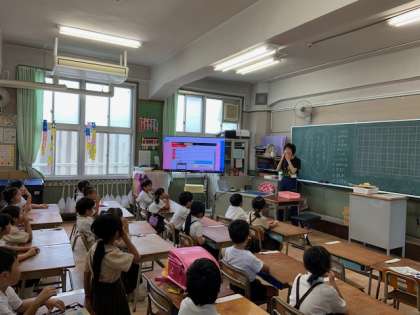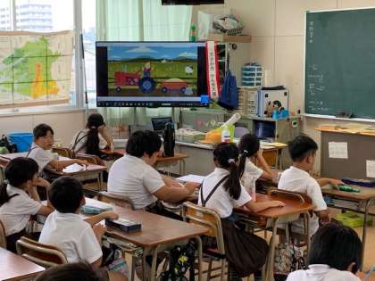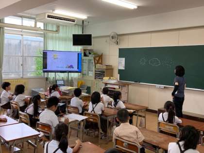 全学年、大型テレビを活用しながら、楽しく英語に親しんでいます。