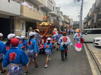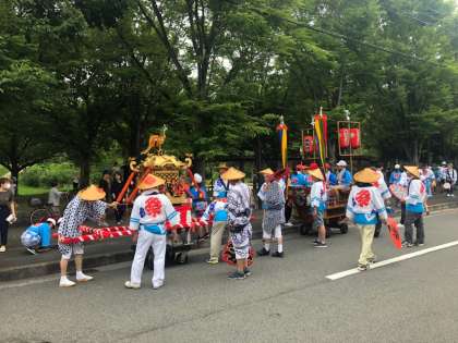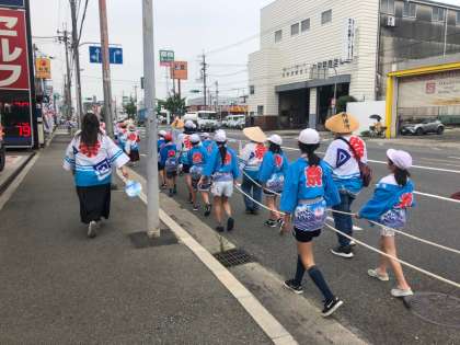 少しだけ小雨が降っていますが、今のところ予定通りに巡行されています。子どもたちは地域の方々に応援されながら、楽器の音色やかけ声を町に響かせています。