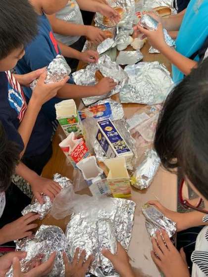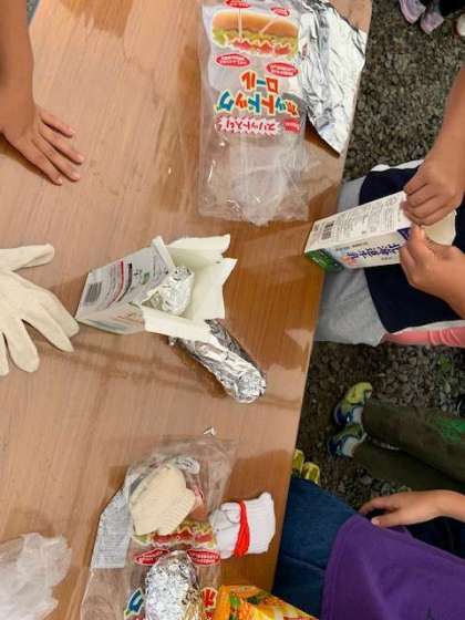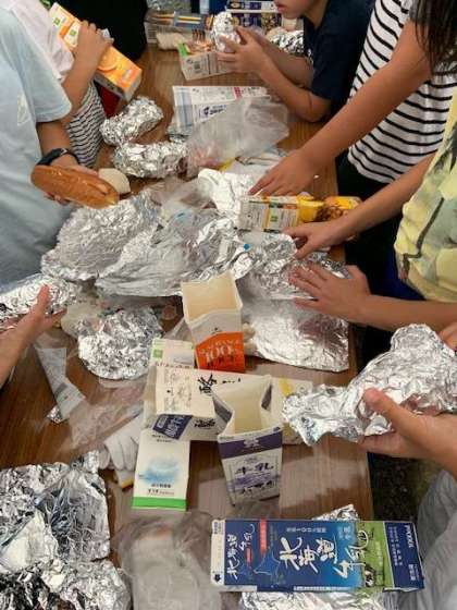 作ったホットドッグをアルミホイルで包んで、牛乳パックに詰めます。