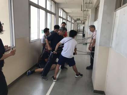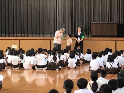 今回の訓練では教職員だけでなく、教室で静かに待機した子どもたちも真剣に訓練に取り組んでいました。訓練後は西成警察の方による防犯教室が講堂で行われ、学校外で見知らぬ大人に声をかけられたときの対応や、大声を出して助けを求める練習などにも取り組んでいます。