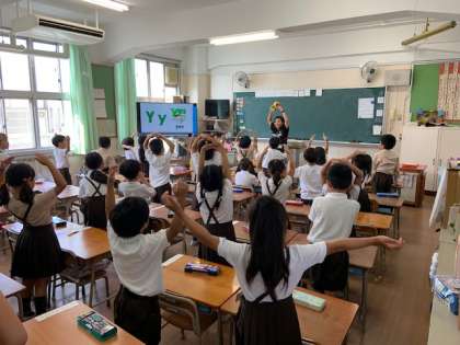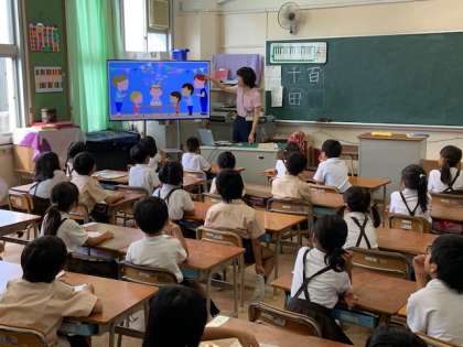 毎週木曜日、朝の学習では全学年で英語活動に取り組んでいます。大型テレビを活用して、映像と音声を使って英語に親しんでいます。