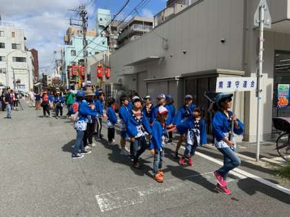 毎年恒例の行事として、区民まつりで子ども神輿のパレードがありました。太鼓の音に合わせて「わっしょい、わっしょい」と大きな声で掛け声出しながら、天下茶屋中学校から区役所までひきました。沿道からはたくさんの応援をうけました。