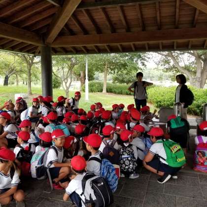 大仙公園に着いたところで、雨が降ってきました。屋根のあるところで、雨宿りです。