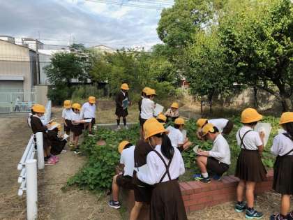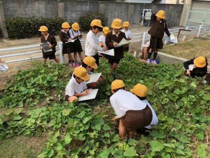 葉の大きさや形はどうなっているか、つるの長さや色はどうなっているかについて観察しました。「葉が大きくなっている」「つるの色は紫色だ」など、さつまいもの成長を見ることができました。