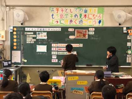 5年生の栄養指導は「バイキング給食にチャレンジ」です。紙上バイキングで、自分で選んだ給食の献立が、バランスのよい組み合わせかどうかを確認したあと、主食・主菜・副菜がそろうよう調整しました。主食・主菜・副菜がそろうことで、栄養バランスのよい献立になります。