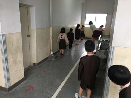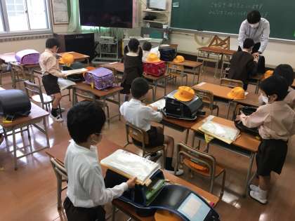 その後,子どもたちは学年の先生と一緒に教室に上がりました。教室では,教室の座席や靴箱・ロッカーの確認やトイレの使い方の確認を行いました。