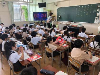 今年度初めて,クラスのみんながそろっての学習です。机と机の間隔をとって,座席を配置しています。