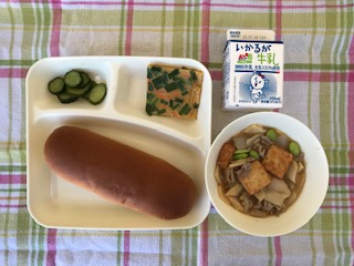 「黒糖パン」「豚肉と野菜の煮もの」「チヂミ」「きゅうりの甘酢あえ」「牛乳」です