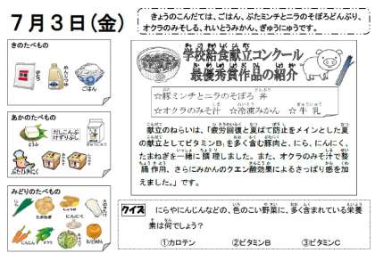 給食では、プチトマト以外の野菜はすべて加熱しています。きゅうりの場合も、熱湯で、歯ごたえがのこる程度にゆがくか、焼き物機で蒸し焼きしています。お家で作られる際は、電子レンジを活用することもできます。