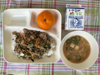 「豚ミンチとニラのそぼろ丼」「オクラのみそ汁」「冷凍みかん」「牛乳」です。