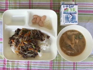 「牛丼」「とうがんのみそ汁」「大福豆の煮もの」「牛乳」です