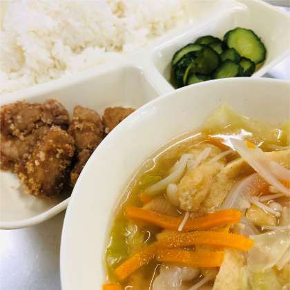 「ごはん」「豚肉の香味あげ」「すまし汁」「あっさりきゅうり」「牛乳」です
