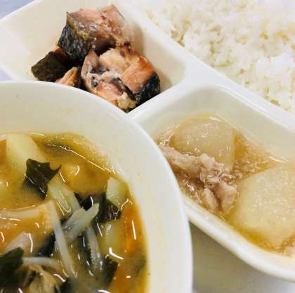 「ごはん」「さけのつけ焼き」「みそ汁」「とうがんの煮もの」「牛乳」です