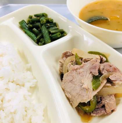 「ごはん」「豚肉のしょうが焼き」「みそ汁」「さんどまめのごまあえ」「牛乳」です