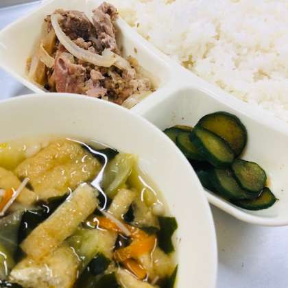 「ごはん」「豚肉のごまだれ焼き」「五目汁」「きゅうりのおかかあえ」「牛乳」です