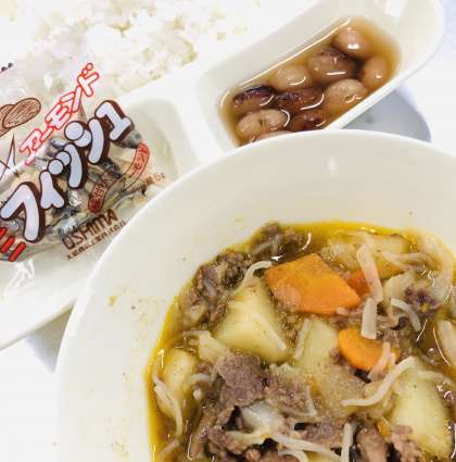 「ごはん」「肉じゃが」「とら豆の煮もの」「アーモンドフィッシュ」「牛乳」です