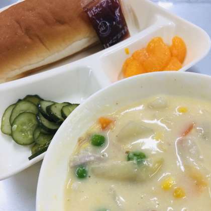「コッペパン」「いちごジャム」「コーンクリームシチュー」「きゅうりのバジル風味サラダ」「みかんの缶詰」「牛乳」です